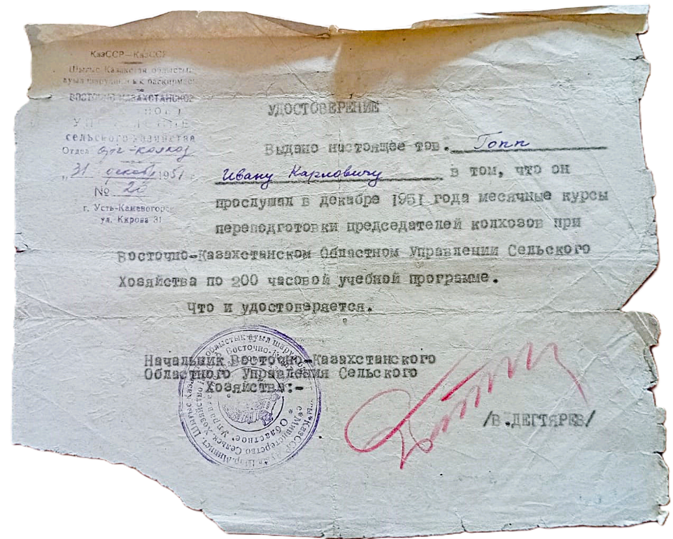 Удостоверение выдано И.К. Гоппу в том, что он в декабре 1951 г. прослушал месячные курсы переподготовки председателей колхозов при управлении сельского хозяйства Восточно-Казахстанской области.