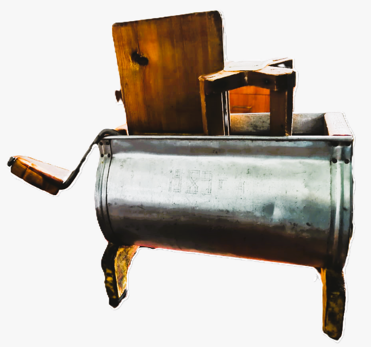 Деревянные маслобойки рассыхались, поэтому по возможности корпус делали из металла. Внутрь вставляли деревянные лопасти, которые вращались ручкой, наливали сливки, сверху закрывали деревянной крышкой. Путем длительного взбивания получали масло. Маслобойку изготовил в 1989 г. Егор Пеннер, житель с. Заборовки.