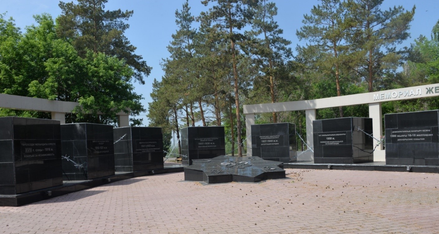 Мемориал состоит из нескольких элементов. Основная часть – семь одинаковых кубов из черного мрамора, расположенных полукругом, связанных между собой колючей лагерной проволокой. На них на казахском и русском языках обозначены периоды репрессий: «1) XVIII в. – 1916 г. – Борьба за независимость; 2) 1918 – 1921 гг.– Ликвидация середняков; 3)1927–1933 гг.–Насильственная коллективизация и массовый голод; 4)1937–1938 гг. – Массовые репрессии; 5)1937–1944 гг. – Депортация народов; 6) 1950 г. – Репрессии национальной интеллигенции; 7) [На каз. яз.:] Период демократического возрождения 1986 г. 16-18 декабря; [на рус. яз.:] Декабрьские события». В центре композиции помещен восьмиконечный постамент – октаграмма, с древности символизирующий равновесие, справедливость, милосердие. На нем в центре высечен знак вечности, по четырем сторонам – символы четырех мировых религий: христианский крест (православный), исламский полумесяц, иудаистская звезда Давида и буддистское Колесо жизни. За кубическими постаментами слева и справа возвышаются две белые колоннады, на верхней части которых на казахском и русском языках обозначено «Мемориал жертвам политических репрессий». В окончании каждой колоннады поставлены стелы. На одной из них приведены слова Президента Республики Казахстан Н. А. Назарбаева: «Память о миллионах людей разной этнической и религиозной принадлежности, попавших в жернова тоталитарной системы, для нас, граждан свободного Казахстана, всегда была и будет священна». На другой стеле на 40 языках сделана надпись: «Вечная память».