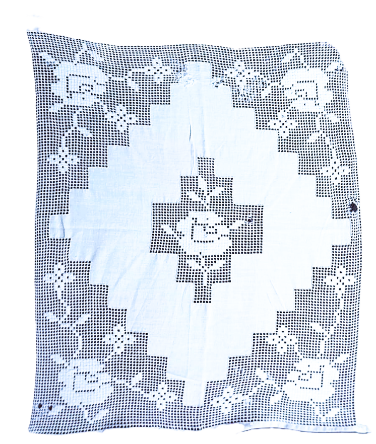 Салфетка по краю подшита тканью. Известно, что она выполнена женщиной–немкой по имени Паулина (фамилия, к сожалению, утеряна), которая была в трудармии на Южном Урале, а потом поселилась в г. Усть-Камногорске. В 2009 г. Любовь Леонтьева, правнучка Паулины, передала все ее рукодельные изделия своей подруге В. Ивлевой.
