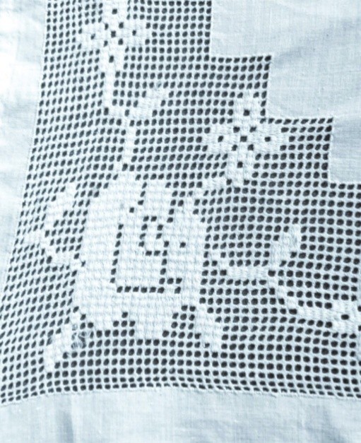 Хлопчатобумажная ткань белого цвета, хлопчатобумажные нитки белого цвета, кружево крючком, ручная работа. Имеются повреждения кружева.