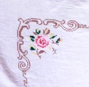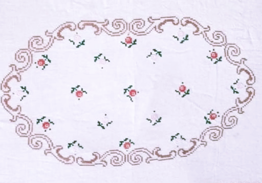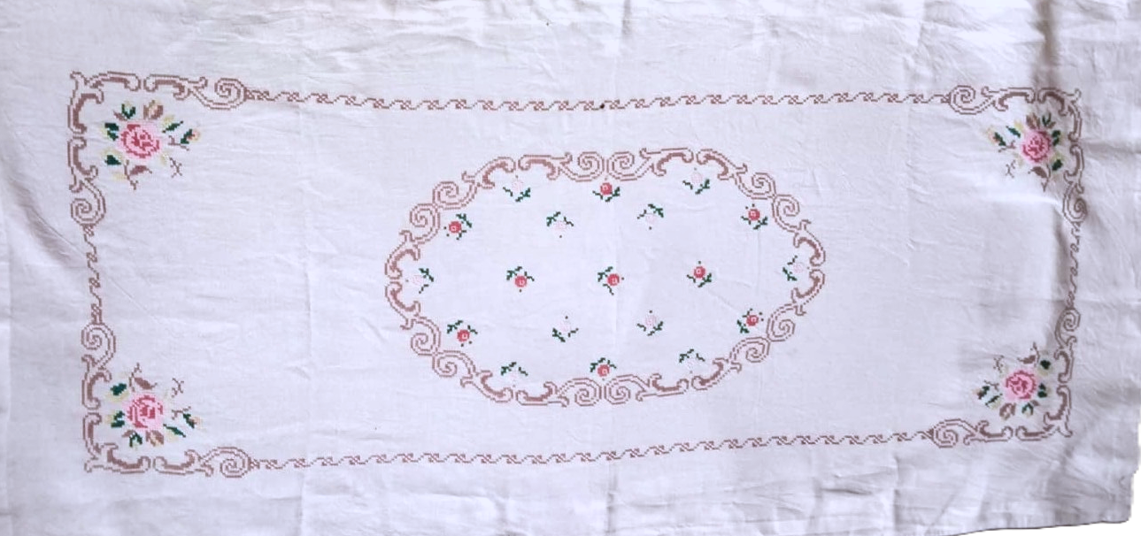 Изображение роз в обрамлении растительного орнамента в виде завитков и листьев растения акант было распространено издавна, особенно в эпоху барокко. Стало популярно в вышивке сер. ХХ в.  Известно, что скатерть выполнена женщиной–немкой по имени Паулина (фамилия, к сожалению, утеряна), которая была в трудармии на Южном Урале, а потом поселилась в г. Усть-Камногорске. Эта же мастерица украсила   комплект для убранства комнаты (см.: 4.5.34 Виртуального музея немцев Казахстана). В 2009 г. Любовь Леонтьева, правнучка Паулины, передала все ее рукодельные изделия своей подруге В. Ивлевой.