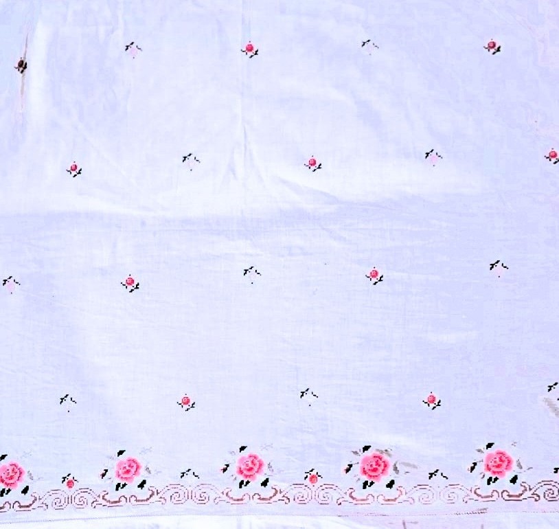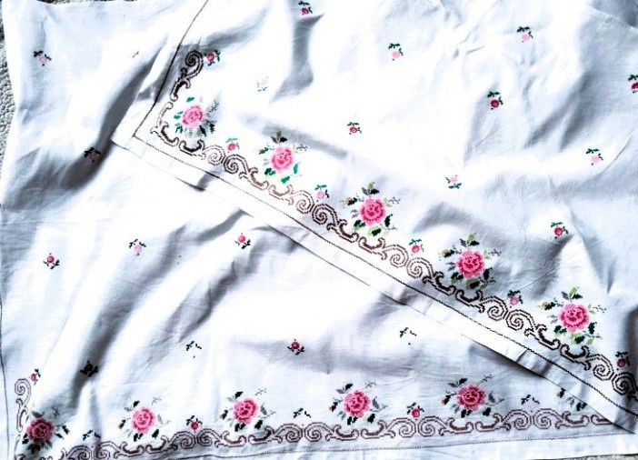 Хлопчатобумажная ткань белого цвета, хлопчатобумажные нитки светло- и темно-розовые, зеленые, коричневые; ручная вышивка крестом