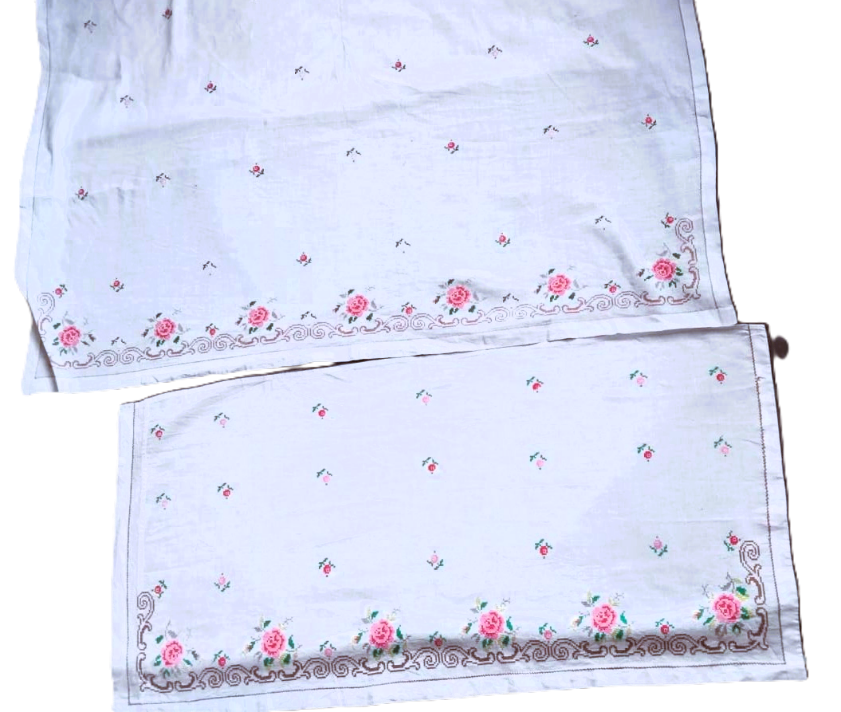 Комплект состоит из 2-х занавесок для окон и 1-й накидки, предназначенной, возможно, для сундука или подобного предмета. Все вещи вышиты однотипно: по низу – кайма из роз и узоров, а по всему полю – мелкие розочки. Подобные узоры известны издавна, особенно характерны для периода барокко. В таком же стиле изготовлена льняная скатерть (см.: 4.3.67 Виртуального музея немцев Казахстана), изготовленная этой же мастерицей. Известно, что изделия выполнены женщиной–немкой по имени Паулина (фамилия, к сожалению, утеряна), которая была в трудармии на Южном Урале, а потом поселилась в г. Усть-Камногорске. В 2009 г. Любовь Леонтьева, правнучка Паулины, передала все ее рукодельные изделия своей подруге В. Ивлевой.