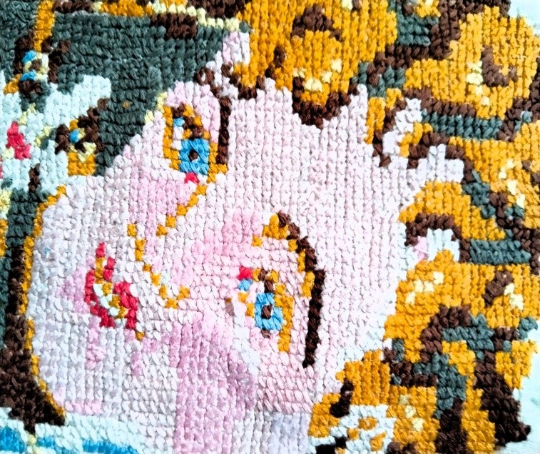 Хлопчатобумажная ткань белого цвета, нитки мулине желтого, коричневого, голубого, белого, розового, черного, красного цветов; вышивка крестиком, ручная работа.