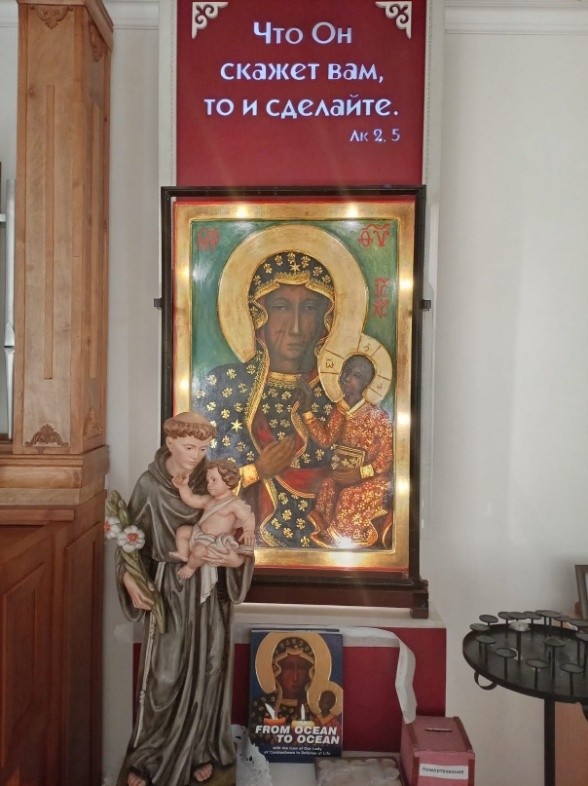 История появления иконы Ченстоховской Божией Матери в храме Матери Всех Народов особенная. Организация Friends of Human Life («Друзья человеческой жизни») / Human Life International –Polska, направленной против абортов, в 2011 г. отметила свое 25-летие. На торжественной мессе специально освятили иконографическую копию, являющуюся аналогом всемирно известной иконы Ченстоховской Божьей Матери, названной «От океана до океана». Эта иконографическая копия была предназначена для католической епархии г. Астаны, а местом ее постоянного пребывания стал приход Матери Всех Народов. «Это дар Казахстану от Human Life International – Polska Казахстану», — сказал архиепископ Томаш Пета, епископ Астанинской архиепархии Казахстана. Польский директор организации Ева Ковалевска добавила, что эта картина «своего рода обетное подношение в защиту жизни в Казахстане, в память о поляках, оставшихся там, об их сыновьях и внуках, которые составляют католическую церковь в Астане и за ее пределами».