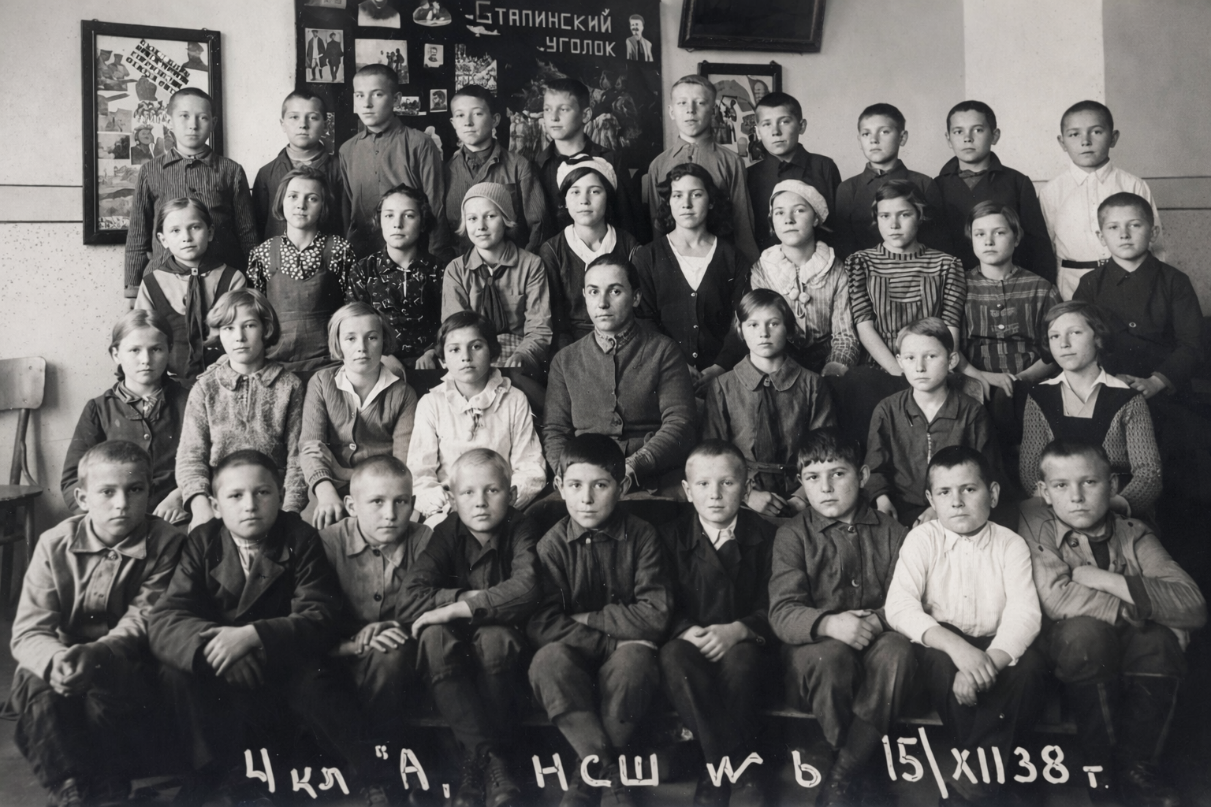 Четвероклассники школы № 6 с. Константиновка, Украина. Во 2-м ряду 2-я справа Фрида Вильгельм (позднее, в замужестве Геринг). Над головой учителя находится стенд с крупной надписью «Сталинский уголок». Можно разглядеть помещенные там фото из биографии Сталина. В советских школах 1930-х годов такие «красные уголки» были обязательной частью интерьера и посвящались идеологическому воспитанию.