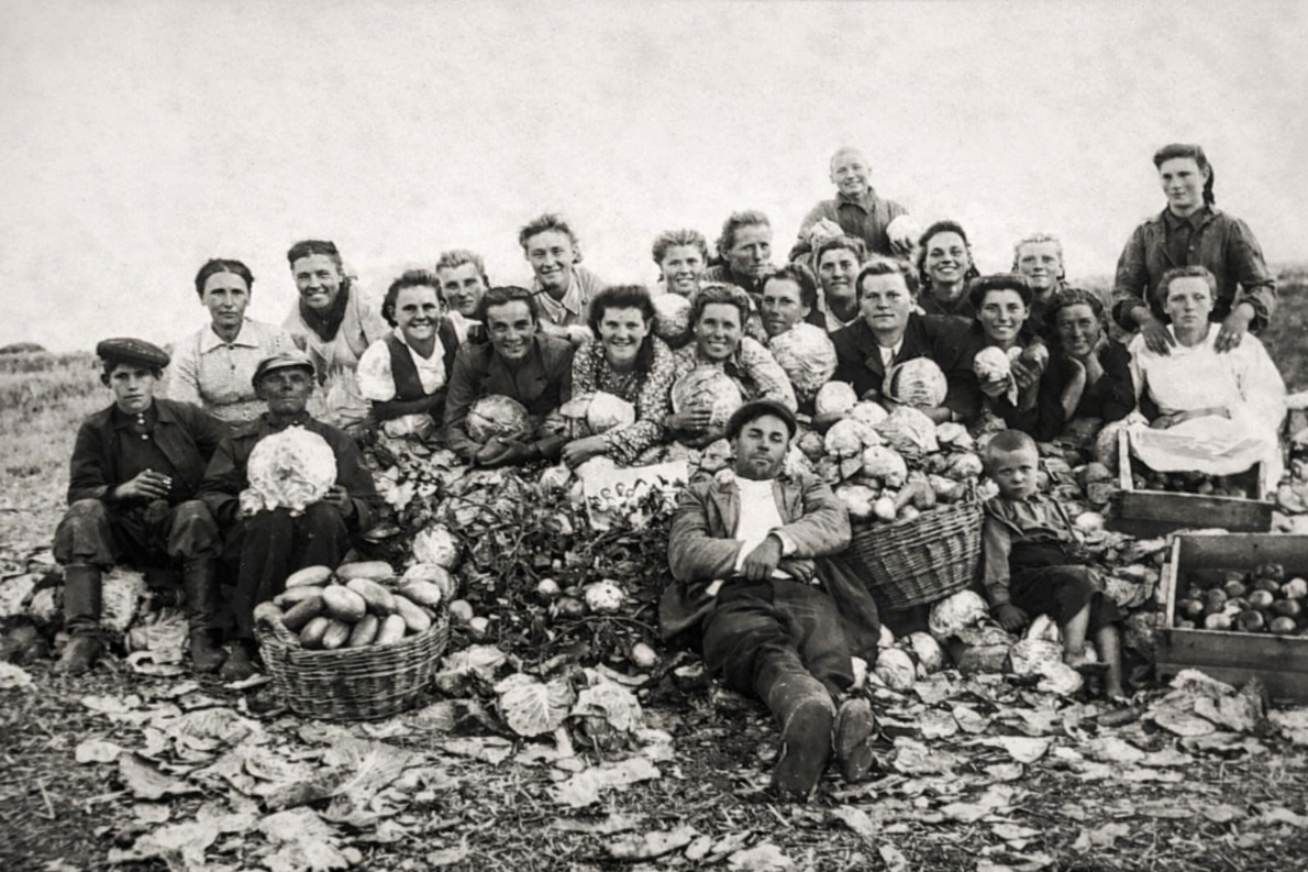 В пос. Ермак (ныне г. Аксу) Павлодарской обл. жили депортированные в 1941 г. из Грузии немцы. Здесь запечатлена сцена уборки овощей в местности, которая называлась «Мазарки».