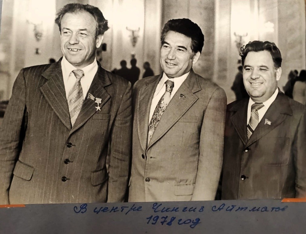 Фотобумага, черно-белая печать. Фото размещено в альбоме. Надпись под фото гласит: «В центре Чингиз Айтматов. 1978 год.»