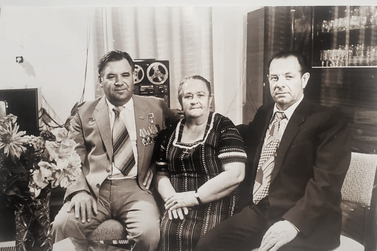 Im Bild: Maria Friedrichowna Häring mit ihren Söhnen Jakow Germanowitsch (links) und Walter Germanowitsch (rechts). Dorf Konstantinowka, Bezirk Uspenski, Region Pawlodar, Zentralgut der Kolchose „30 Jahre Kasachische SSR“.