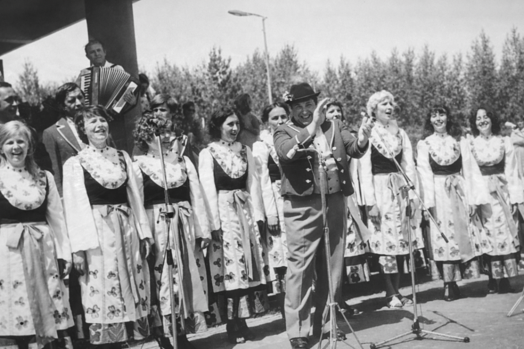 Korney Wedel, Solist des deutschen Volksmusikensembles „Ernhold“, tritt im Dorf Konstantinovka auf. Im Hintergrund ist der Leiter des Ensembles, Alexander (Emmanuel) Ivanovich Schiller, mit einem Akkordeon zu sehen.